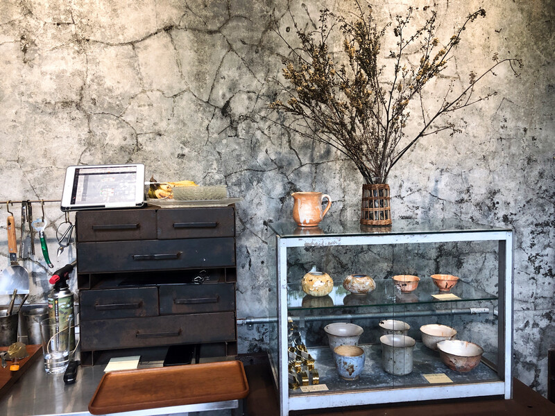吧檯旁的玻璃櫥櫃是「燃候 。」的杯、碗、花器手工陶製商品和「RiSk」出品的銅盤和掛勾。想要為生活增添情趣或收藏,現場有販售可購買。