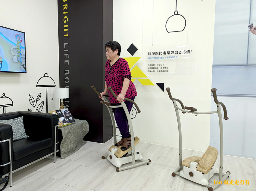 這次體驗了「經典倒立椅」、「超慢跑機」、「深蹲拉筋機」和「手足兩用飛輪機」,其中我覺得最適合銀髮族的產品是「經典倒立椅」和「超慢跑機」。
