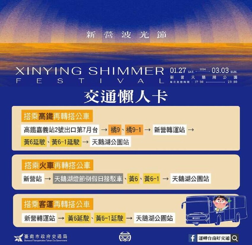 及 天鵝湖燈節例假日接駁車(往返新營火車站及天鵝湖公園,除夕當日不行駛),