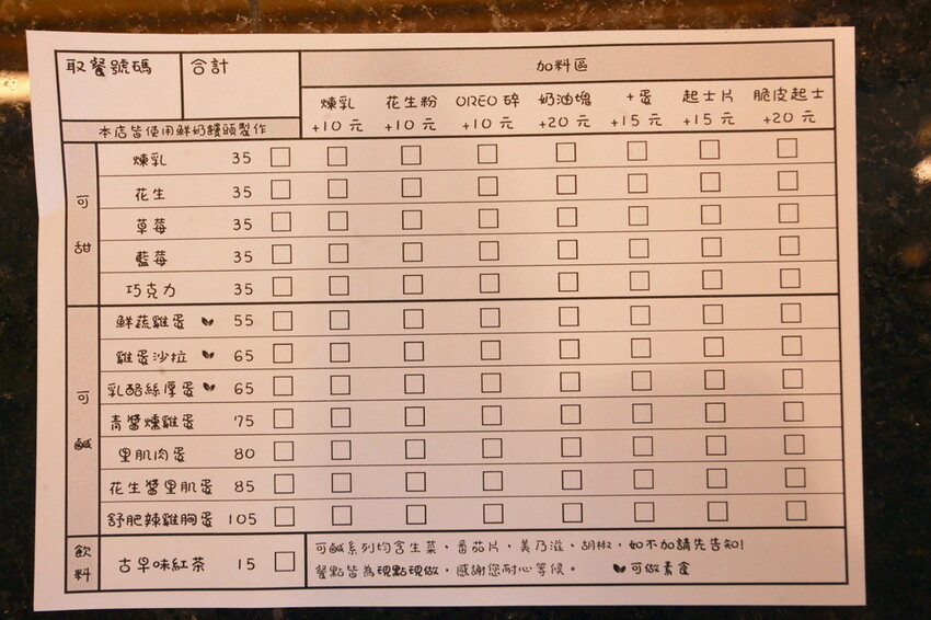 攤位上有貼上菜單供顧客點餐參考,想點餐攤位上有菜單供自行畫選,菜單以壓扁饅頭為主加古早味紅茶,很吃澎湃點需要額外加價點選,小高覺得整體定價還算合理。