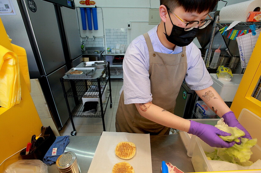 這份花生醬里肌蛋壓扁饅頭份量十足,這饅頭是選用鮮奶饅頭來製作,饅頭切開經過熱壓,中間抹上花生醬再放入豬肉、荷包蛋、生菜及番茄片等食材。