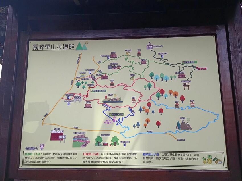 這是矗立在阿罩霧步道路口的解說牌,依顏色來規劃出不同步道,大家可依據自己的體力來選擇要走哪一條
