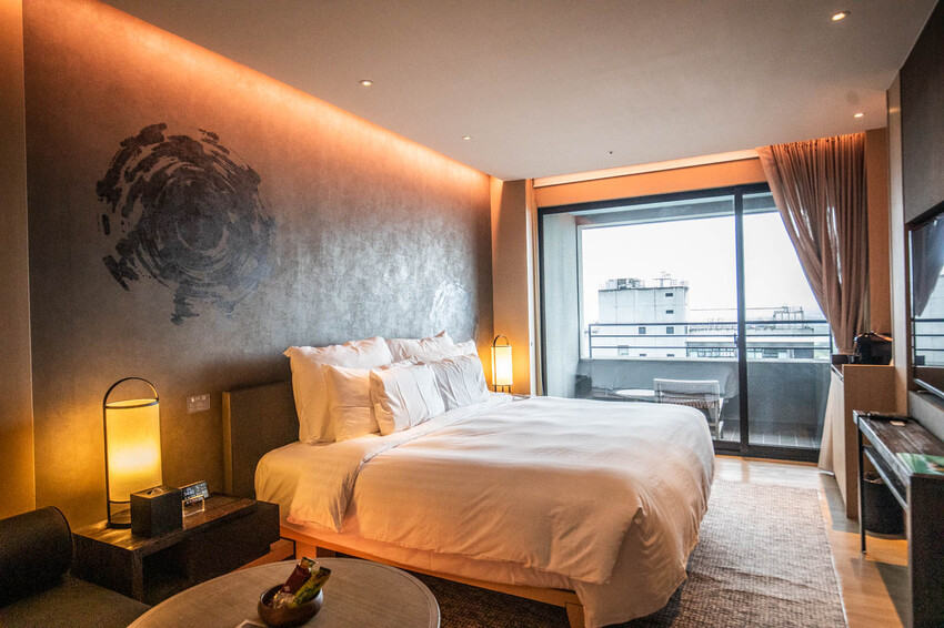 這次我們選擇入住的方案是,房型是乘風居,客房以溫潤、沈穩的木韻質樸溫暖的主調氛圍,一進來乘風居首先是臥室空間,入門是深藍色的舒適沙發及小茶几,可以在這邊歇息,然後床鋪真的厲害,竟然是席夢思的床墊,應該是目前睡過數一數二厲害的床了