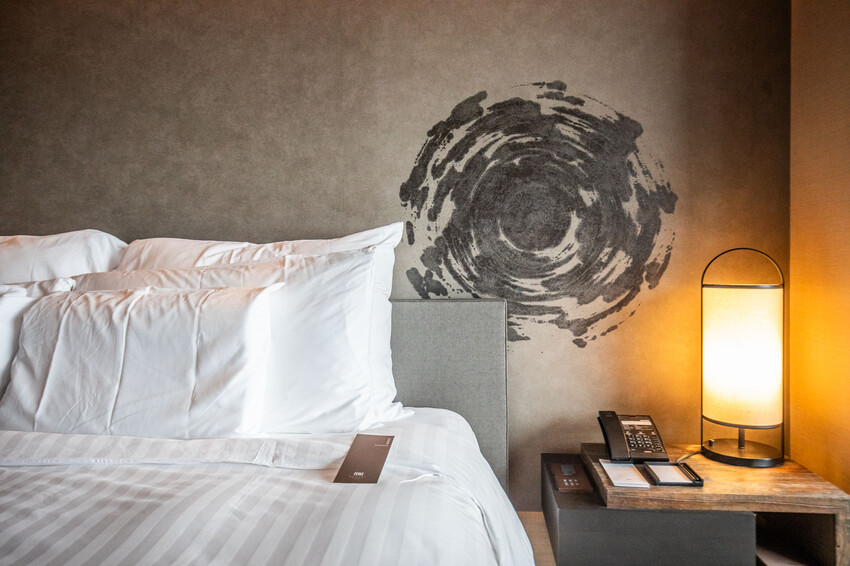 床頭的設計也很有意境,是『自需空中迴旋而來』授權作品的特殊印刷,圍繞著寧靜、自然的主軸,讓人從靜謐典雅的氛圍中感受純粹的生命力,而床邊還有Hello Ai智能小幫手,用說的就可以控制房間內的燈光跟電視,滿滿的科技感,床上放了四顆材質不同的枕頭((羽絨枕/海綿枕/乳膠枕/化纖枕)可以隨自己喜好挑選來睡