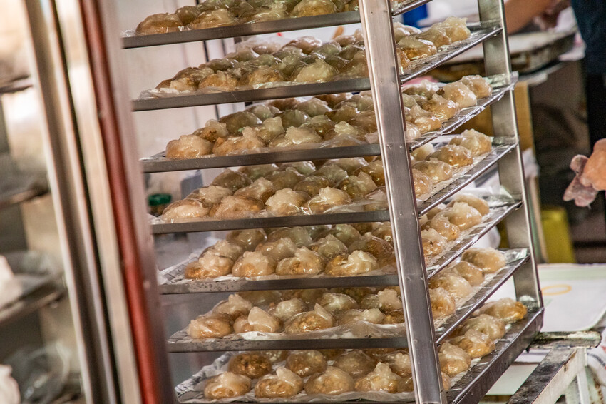 營業時間是九點營業,但他也不是九點就開始賣,九點還在做第一爐,等到第一爐蒸好已經是九點半了,所以要等第一爐的朋友大概需要等差不多一個小時,後方就是水晶餃的作業區,做好的水晶餃會推到門口的蒸箱裡蒸