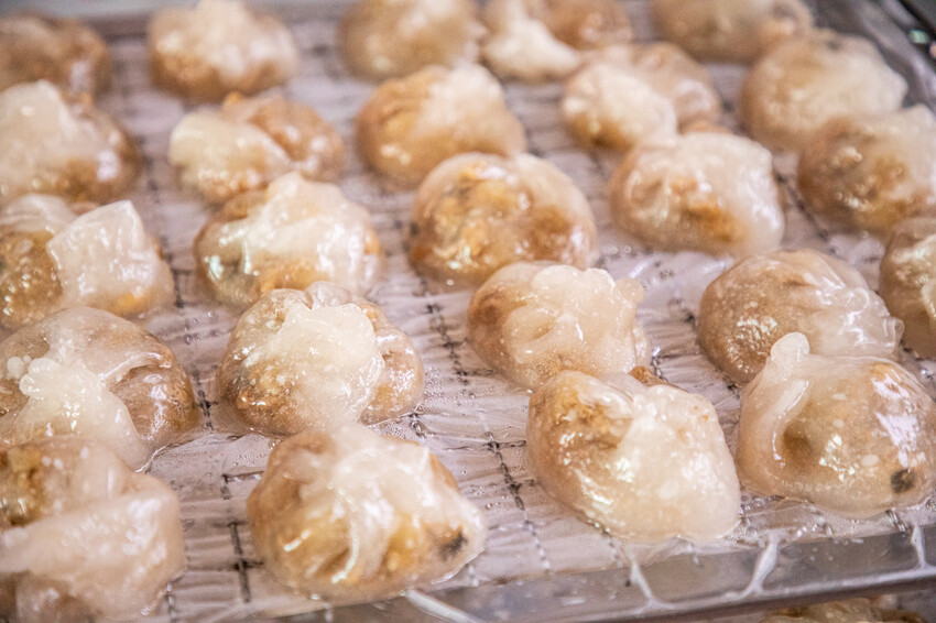 隨著水晶餃出爐,現場就開始躁動了起來,終於可以拿貨啦,隨著裊裊炊煙,原本白色的水晶餃也變成晶瑩剔透的模樣,看起來QQ彈彈得好誘人,水晶餃會取出大概吹涼一下
