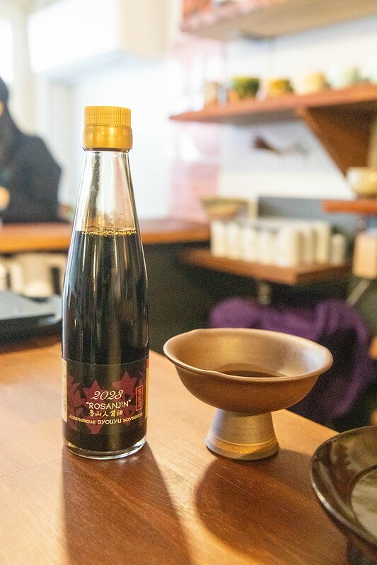 見我稱讚醬油香,年輕老闆特別把他用的醬油拿給我看,我當初是門外漢,查了一下和歌山紀州湯淺據說是日式醬油的發源地,魯山人指的是日本著名是料理家、美食家的北大路房次郎(魯山人)愛用的醬油,其地位就像金山寺的味噌、糖的三盆糖般。2012年後,為了紀嗜醬油如命的魯山人,「湯浅醤油丸新本家」每一年都會出一款專門的「魯山人醬油」。