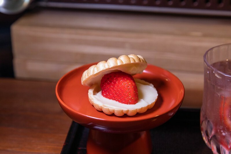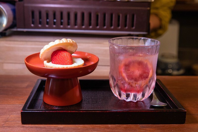 二訪點的草莓最中,最中的殼也在客人面前現烤,看老闆兩間緊盯著爐火的神情,是一種享受。