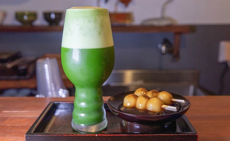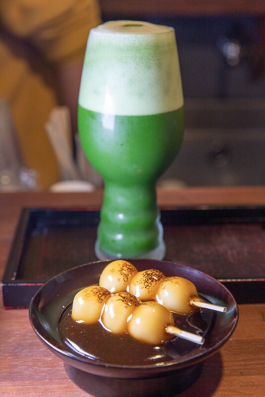 這是一訪時我點的抹茶啤酒,也正是這杯吸引我進來,同樣的抹茶也是我點了後,老闆才開始用熱水涮茶,之後倒入啤酒裡。說來這啤酒本身就帶啤酒花的微苦,而現沖的抹茶也滿是苦香,兩苦加在一起,卻調和出另一種前後極有層次的不同苦,加上啤酒是冰的,抹茶是熱的,兩者的香氣也有所不同,那時嘴裡的交融顯然是很有意思,讓我一邊喝一邊微點頭,那滿足的讓老闆一直微笑以對。