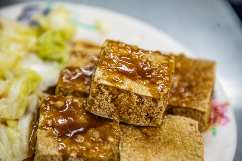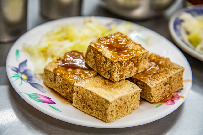 臭豆腐一份有五塊,一旁有搭配台式泡菜,現在市面上的許多臭豆腐為了追求外皮的酥脆,往往炸過頭,導致裡面變得有些空洞,失去了臭豆腐應有的口感,但興加臭豆腐就處理得恰到好處,外皮酥脆而內裡依然維持著臭豆腐特有的柔嫩,微臭而不過分的風味,搭配蒜汁醬料,實在是美味無比!