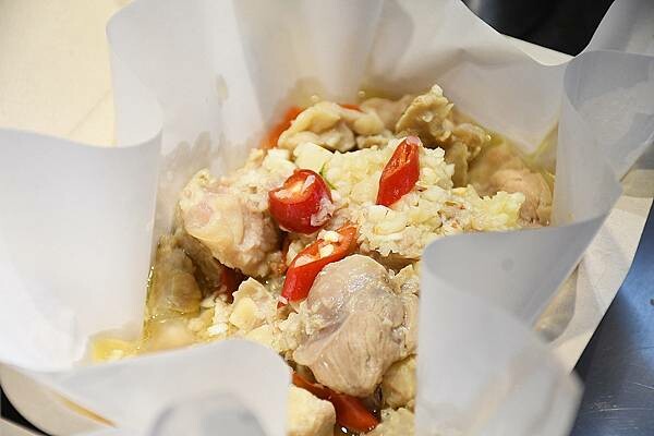 那醬汁結合雞肉的香氣呈現出一股鹹甜、蒜香的美味