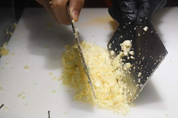 新鮮的生蒜先壓碎,再進行剁蒜的動作,我的天啊~真的很快、很細緻