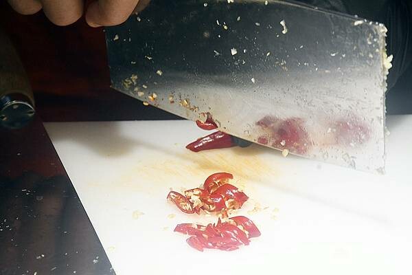 每一次肯定都檢查、確認、再確認,把蒜頭剁到一定的碎度後才停手