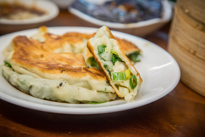 蔥油餅,蔥油餅都是由主廚現點現做,桿皮上油再加上大量的青蔥包捲,桿成圓餅下鍋烙,蔥油餅酥脆香軟,蔥香四溢,越是咀嚼蔥香及麵香越發濃郁,好吃!