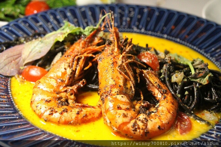 草蝦墨魚麵佐黃金流沙醬$380
