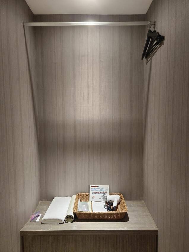 入門左手邊就是這個開放式衣櫥,上面的衣架可以讓人掛衣服,下面的竹籃內則有吹風機和備用毛巾,因為他們也是環保旅店,不主動提供牙刷或拖鞋等備品,但如有需要可以直接告訴櫃台