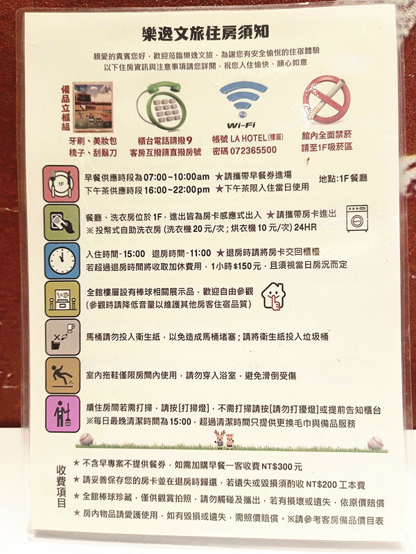 住宿須知上面有關於早餐時間,wifi密碼和餐廳洗衣房的使用說明,住客如有任何疑問都可拿來參考