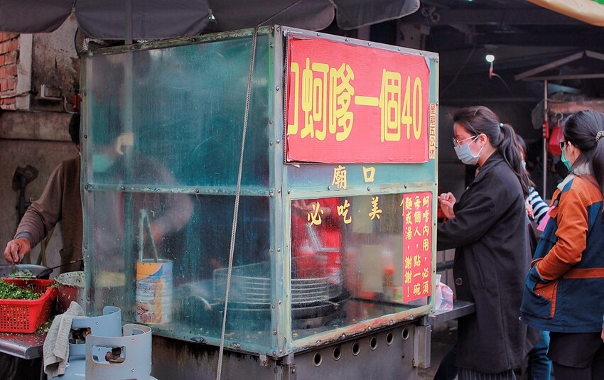 超推這家最靠近拱天宮前廣場的”廟口蚵嗲”,就在廟口麵食館旁,就只賣一份40元的蚵嗲,醬料選擇很多樣。