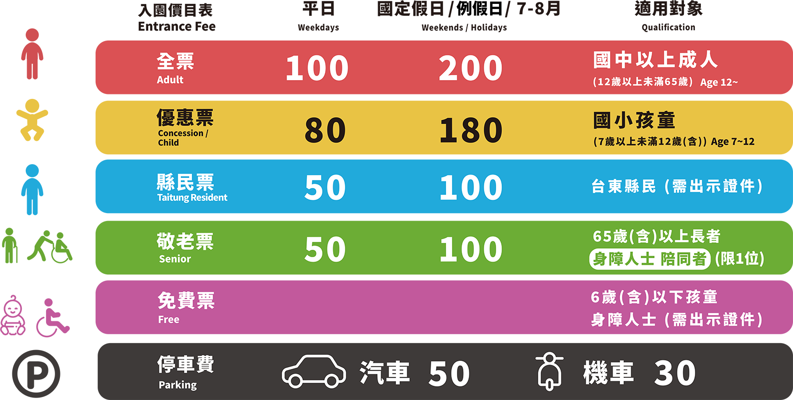 ★全票(12歲以上未滿65歲):平日$100元;假日$200元