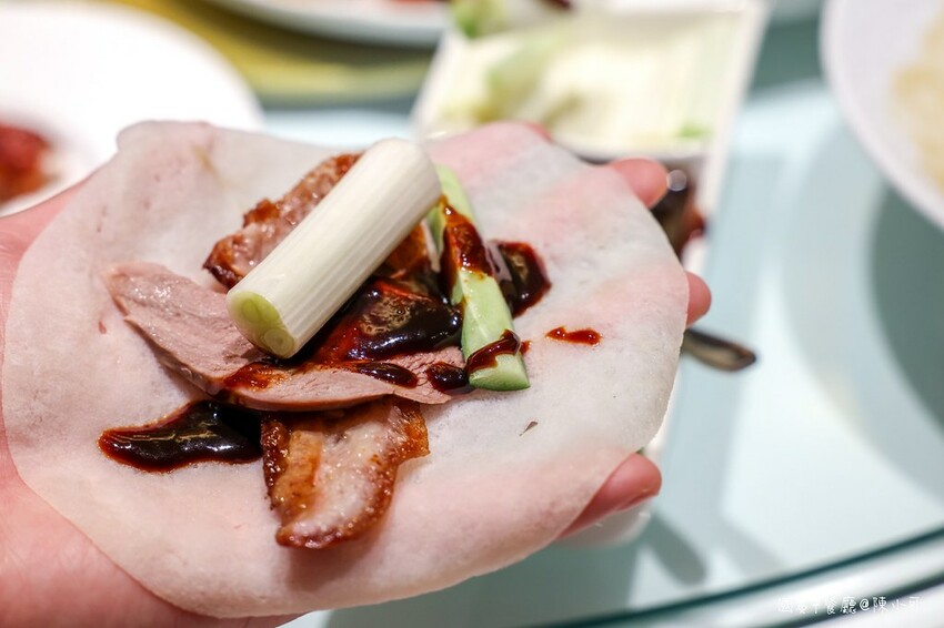 國賓中飯店的片皮鴨卷餅除了荷葉餅、片皮鴨、蔥段、小黃瓜和甜麵醬,柔嫩的餅皮包著鴨肉等餡料,滋味甜香鮮美,蔥段帶有一點甜味和辛香,多層次豐富的吃法,最經典也是我最喜歡的吃法。