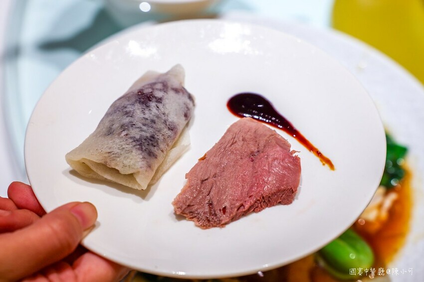 國賓中飯店的烤鴨比較特別的是現場用煮沸的水來加熱荷葉餅,所以拿在手上的餅皮連同裡面鴨肉都還保持溫熱的口感。