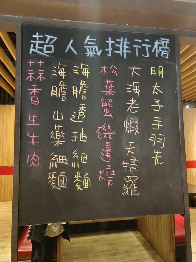 黑板上寫的是店內超人氣排行榜,包括蒜香生牛肉,海膽山藥細麵,松葉蟹磯邊燒,大海老蝦天婦羅和明太子手羽先等