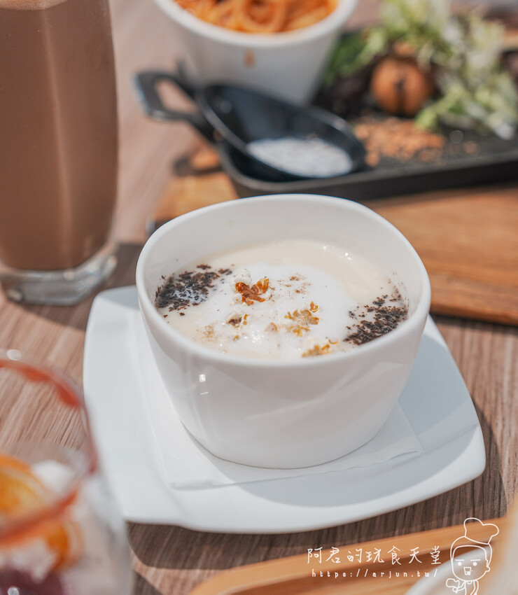 這道濃湯最讓我驚喜的地方,在於它將甜與鹹完美融合,湯上面撒上了OREO巧克力粉,還點綴了幾顆爆米花。