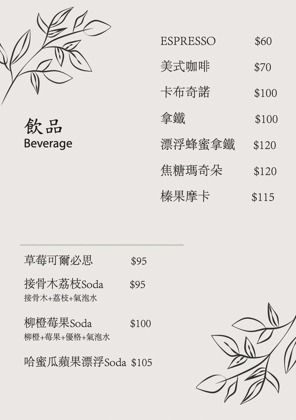 飲品選擇也很豐富,從經典的咖啡、茶品到創意的調飲,能滿足各種口味。
