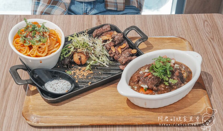 老婆選了燉牛頰、乾煎霜降牛雙拼當主餐,搭配上一份義式茄汁紅醬義大利麵。