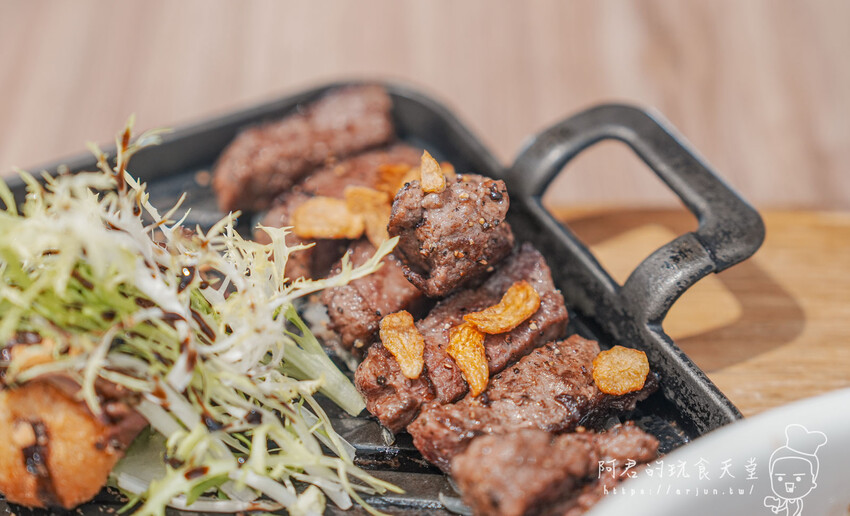 霜降牛鮮甜與柔軟的肉質,與蒜片的脆與香,讓每一口都是那麼的享受。
