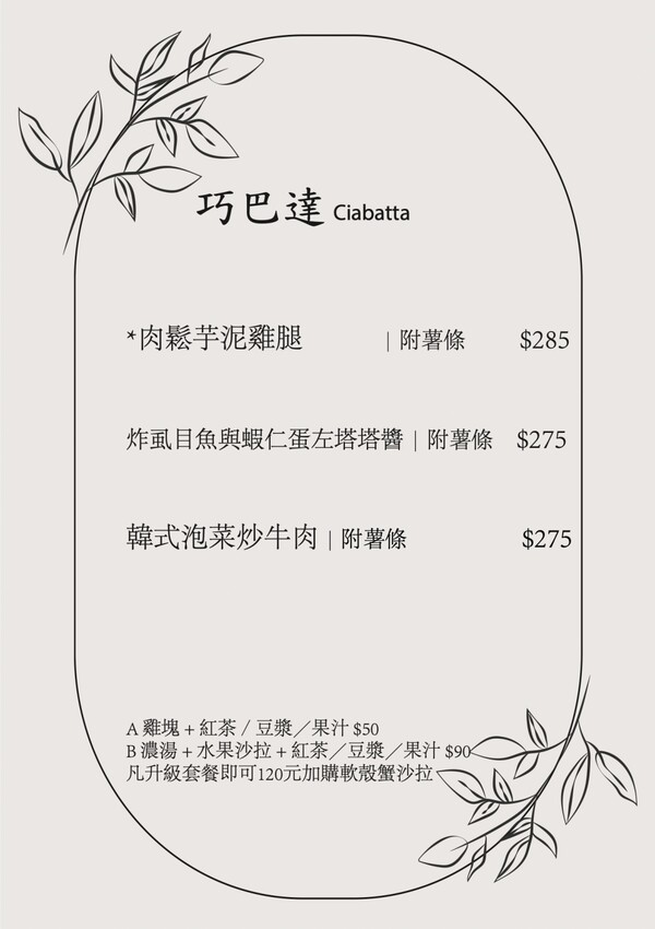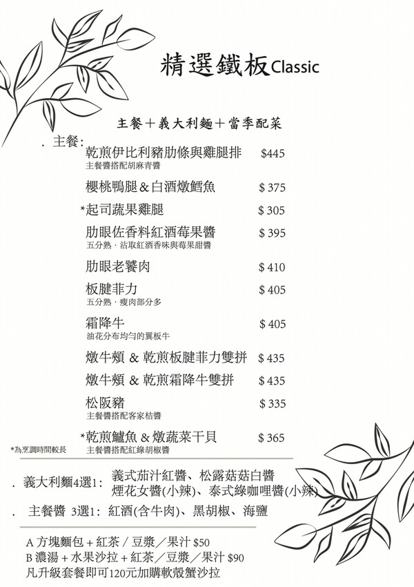 鐵板主餐的部份,可選擇義大利麵及主餐醬,另可加價升級成A、B套餐,會更划算。