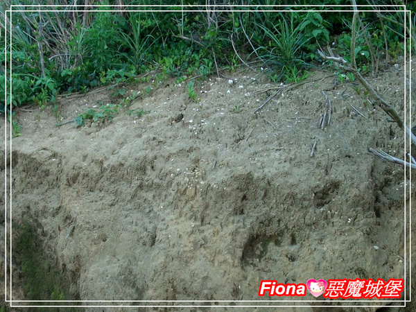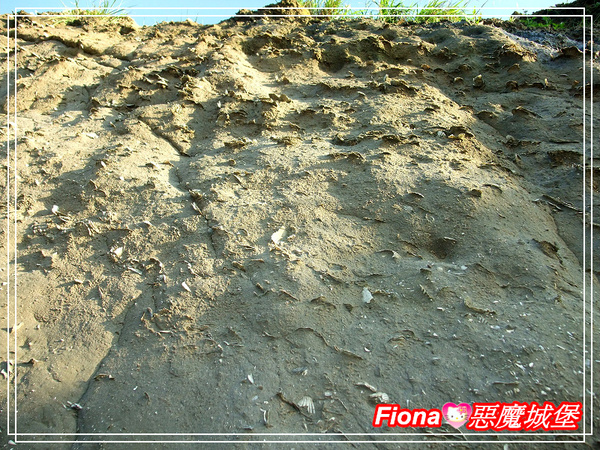 回到車上,再往前開一些,就在苗33鄉道左側路旁,有一座半削的裸露山壁,這就是後龍最有名的「過港貝化石層」啦!!