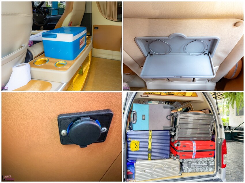 而且每個位子都有著杯架可以置放水瓶,而且每個座位區都有附設充電裝置,都不用怕手機沒電隨時可以充電,我們這次出門六位大人共有六個大行李箱,超大的空間可以放置行李,除了車子很讚外,司機的服務態度也很好,會很細心地告訴我們車子停在哪裡喔!
