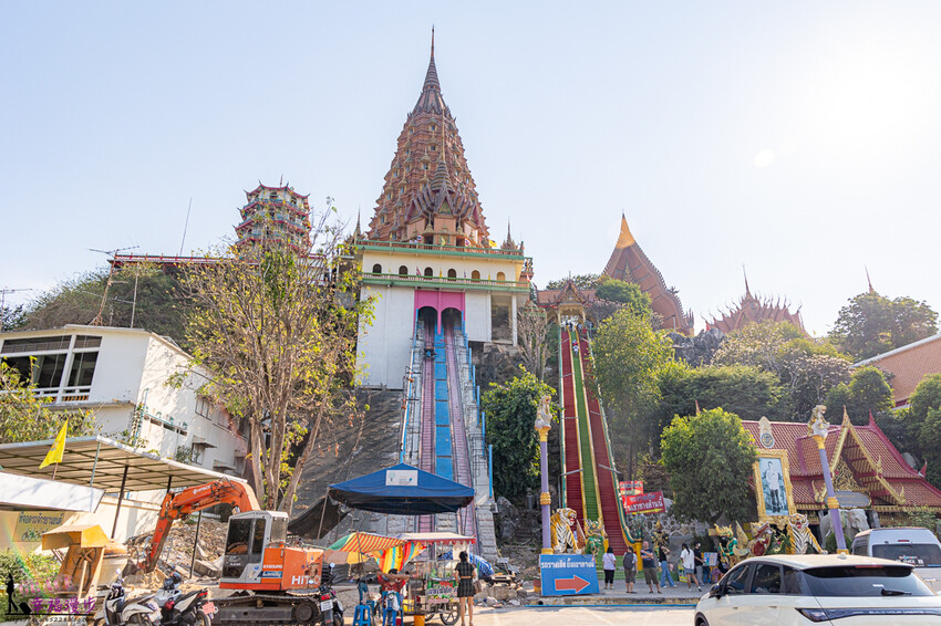 泰國虎穴寺wat tham suea,這裡是北碧府最出名的一間寺廟,雖名為虎穴寺但裡面卻沒有老虎,要上去虎穴寺時須走一段非常陡峭的樓梯,好像也可以搭纜車上去,但我們來的時候纜車正在維修,上面有高達18米的金色大佛,整個景色相當美。