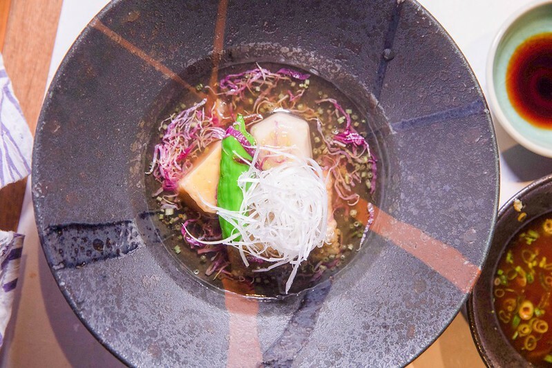 炸過的境港鱈魚白子連同高湯、菊花、柚子一起餵煮,酸甜入味半點沒破壞白子本身的鮮,反而帶出不同層次的甜,里芋六方指的是把芋頭切成六角柱形,是日本懷石料理常見的手法,搭配鳥取山陰一帶非常有名的白蔥絲。