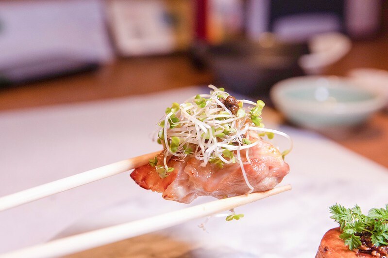 大山雞朝倉燒,大山雞向來是我的心頭好,這半炸半烤的雞肉軟嫩透著微微的肉汁,上面是豆苗加了一點點像是味噌增味。