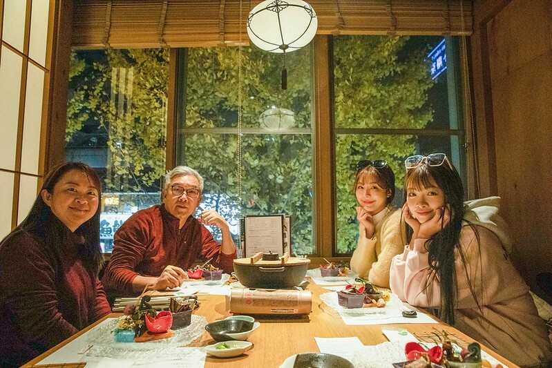基本上美酒佳肴ゆらく的座位1樓有33席,二樓有2-30人的大小包箱,這一天和三位鳥取觀光大使(焦哥、倪暄、曲羿)一起用餐,包廂是可以坐六人的小包廂,窗口緊臨滿滿銀杏的大馬路。