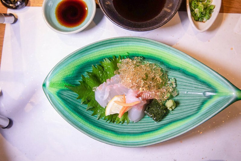 靜節生魚片佐酸甜的土佐醋凍,紫蘇、漬昆布、檸檬,當然也有芥末,吃法相當多元。