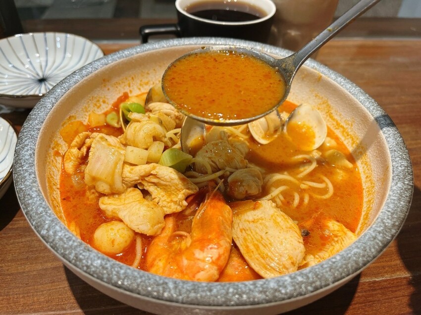 企鵝和朋友各點一個紅醬的海派海陸總匯義式湯麵和泰式酸辣海陸總匯義式湯麵~
