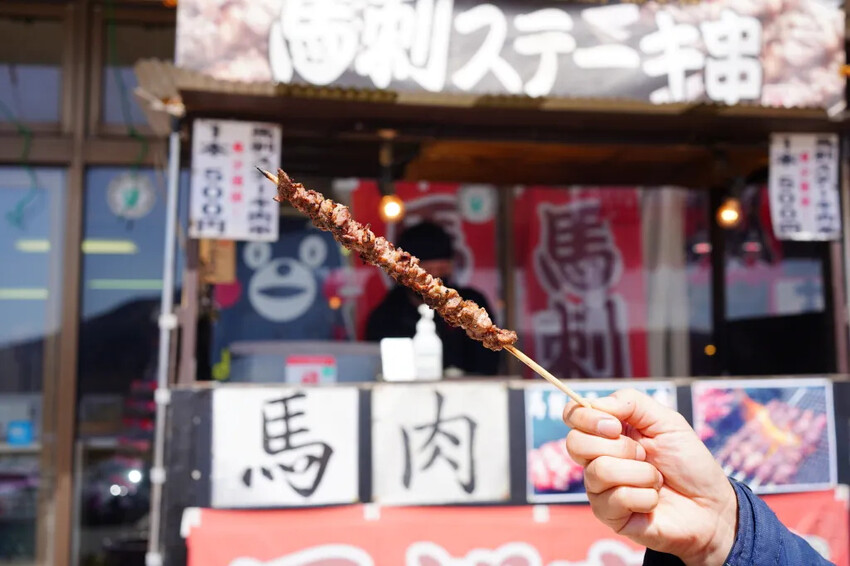 伴手禮店外面還有在賣馬肉烤肉串的攤位喔,馬肉還不錯吃,還蠻有咬勁的!!!