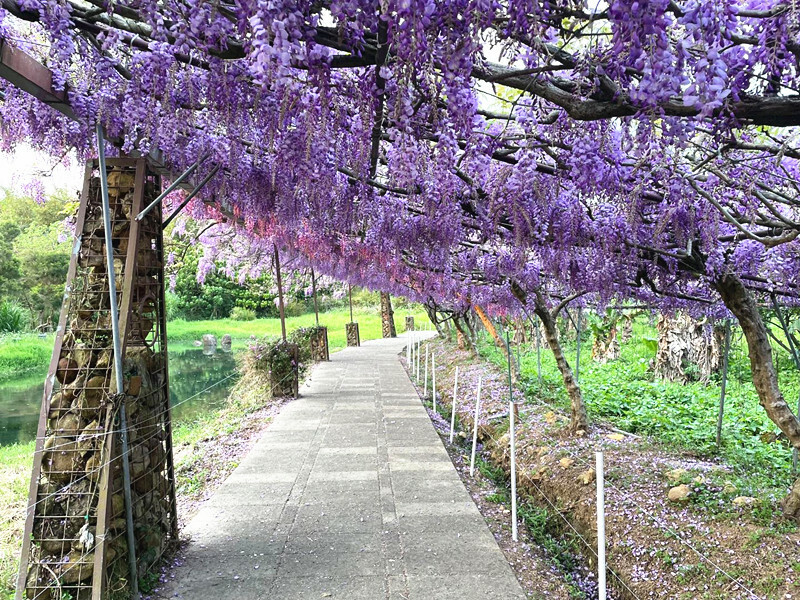 穿過重重紫藤花架,前面還有一個綠草環繞的水塘,讓人忍不住趨前一探究竟