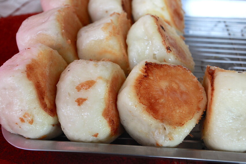 老闆與員工正在包覆著每一粒水煎包,就看這麵糰就覺得應該是使用老麵才對。