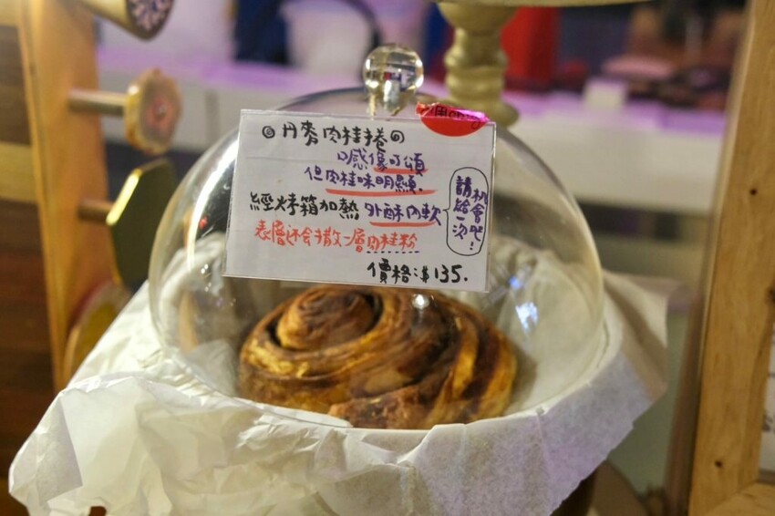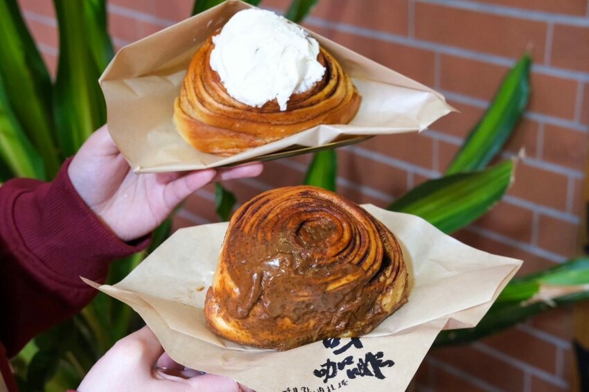 ▼招牌肉桂捲共有超多口味可挑選,依照當日現場出爐為主,肉桂捲份量比外面的大不少,口感彈Q層層堆疊是最大特色,每次來必點的橙香伯爵肉桂捲,吃得到茶香和解膩的柳橙香氣,伴隨著溫和的肉桂辣香味好過癮,另一款新口味日本進口北海道乳酪肉桂捲,頂頭擠上滿滿的邪惡餡料,濃厚奶香跟肉桂意外也好搭啊!