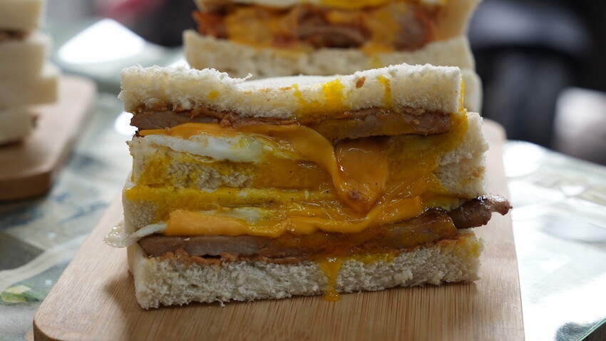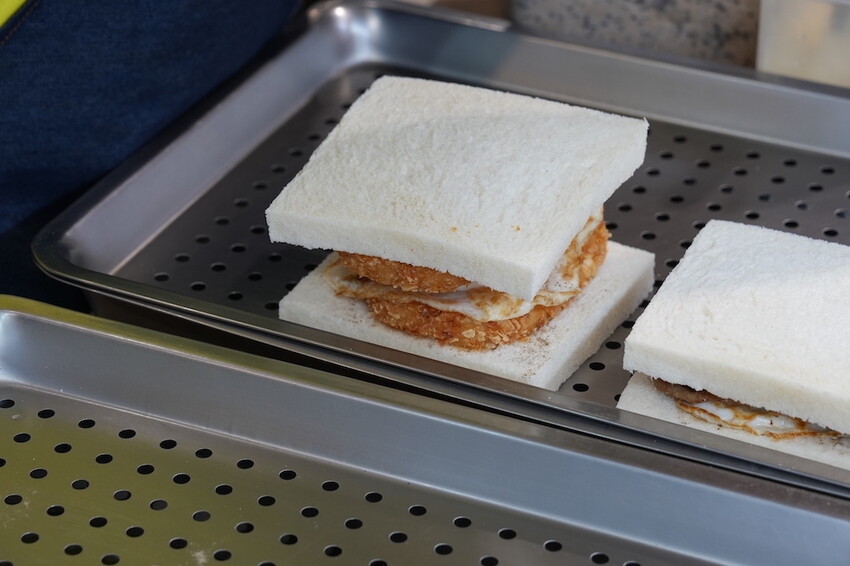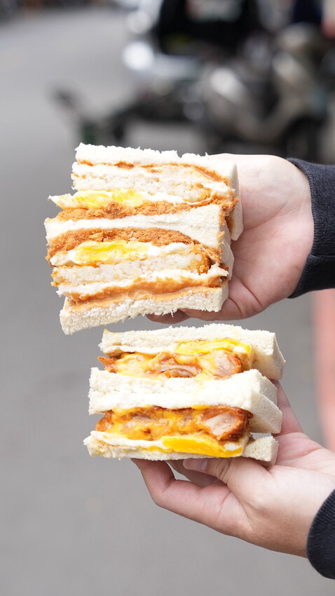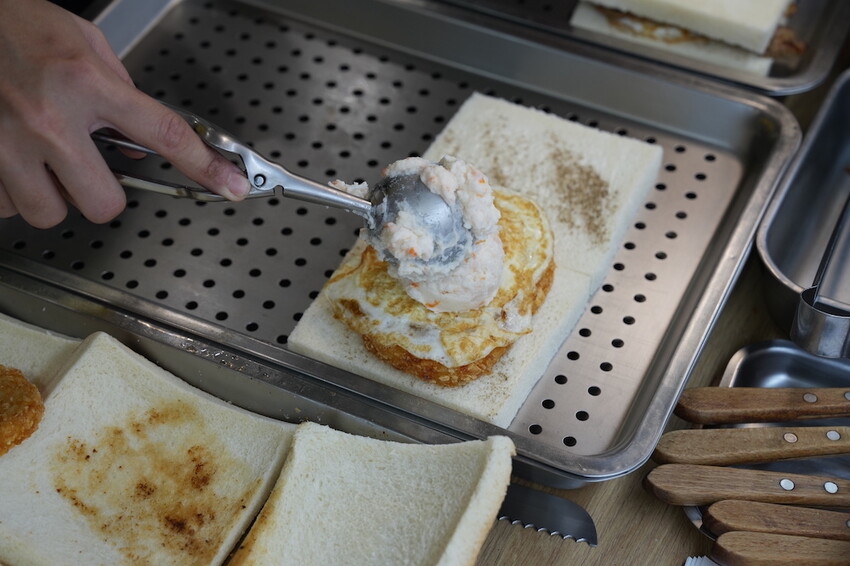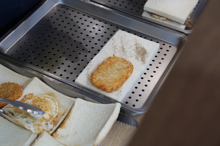 今天點了招牌肉排蛋吐司 、雞腿排蛋吐司跟薯餅肉鬆蛋吐司在旁邊看著店員一層一層的抹醬、放上薯餅跟蛋等等內餡