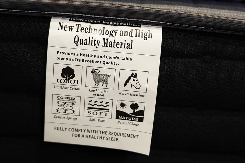 床墊邊車縫上各種認證標!像是長纖獨立筒、ISO9001與SGS認證、ISPA國際睡眠協會標誌,床墊材質100%棉、羊馬毛天然纖維組合,面料耐用、抗皺、好護理~