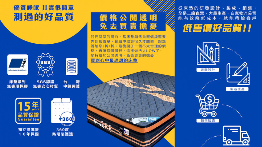 床墊保證都是台灣工廠自己製作!用的原料都是SGS認證材料,台灣環境較潮濕,會讓床墊老化,現場貨量有限,都是接到訂單開始製作,不用擔心床墊都放很久,加上工廠自己有物流配送,可以快速出貨,還有售後服務保證~