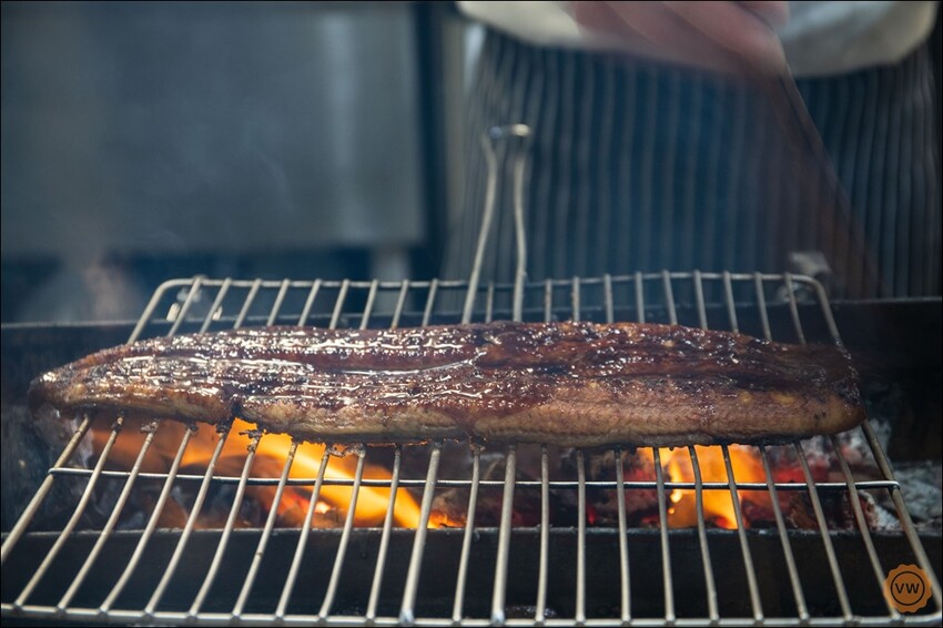 大江戶町 鰻屋 是採用直火碳烤的製法,所以考驗的是烤鰻師傅本身的功力;在高溫的炭火上以直接碳烤的方式,不僅要能同時保持肉質飽滿且細綿的口感,更要藉高溫炭火來鎖住鰻魚原本既有的細膩油脂,才能使魚肉與油脂兩者交融出美味。