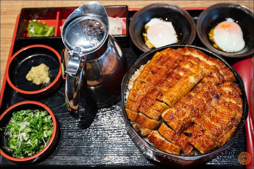 今天vickey點的這份套餐是雙人份的,內含雙人份的碳烤鰻魚搭配白米飯、還有一壺柴魚高湯、芥末、蔥花、兩顆有機溫泉蛋及雙人份量的漬物,像是醃漬白蘿蔔及紅薑片,小菜。