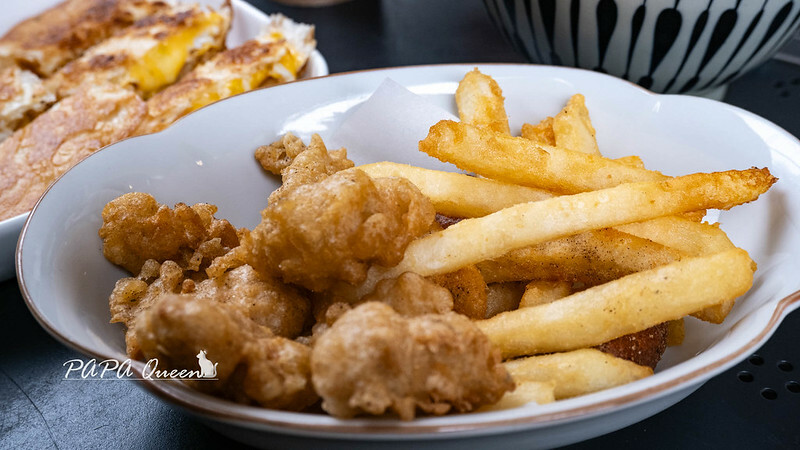 額外升級2套餐,老闆直接拼再一起!炸物變得很豐盛,唐楊G沒有刷醬,很酥脆麵衣單純撒上胡椒鹽(與剛剛拌麵是同款),薯條組除了薯條之外還有三粒椒麻小香腸