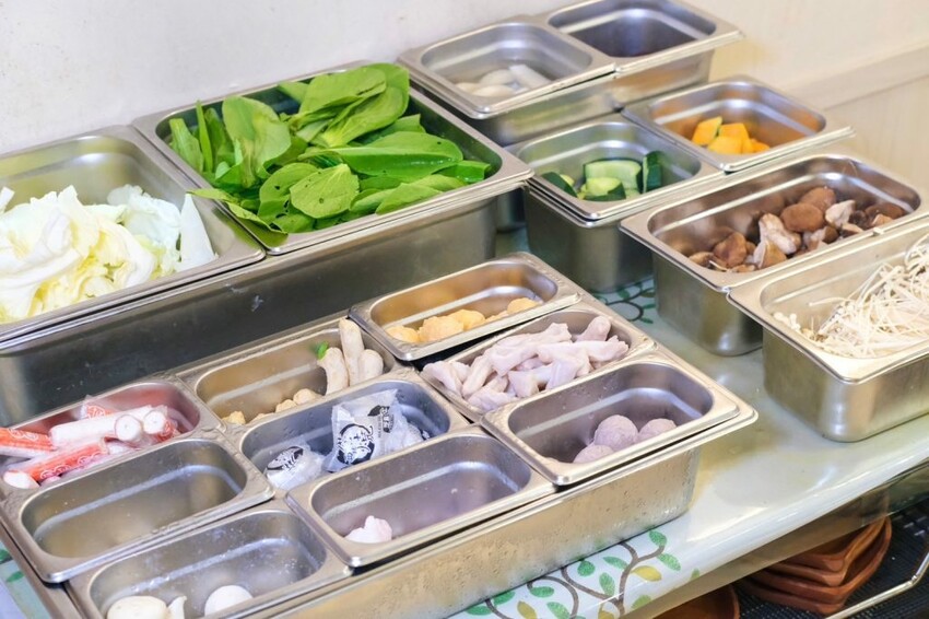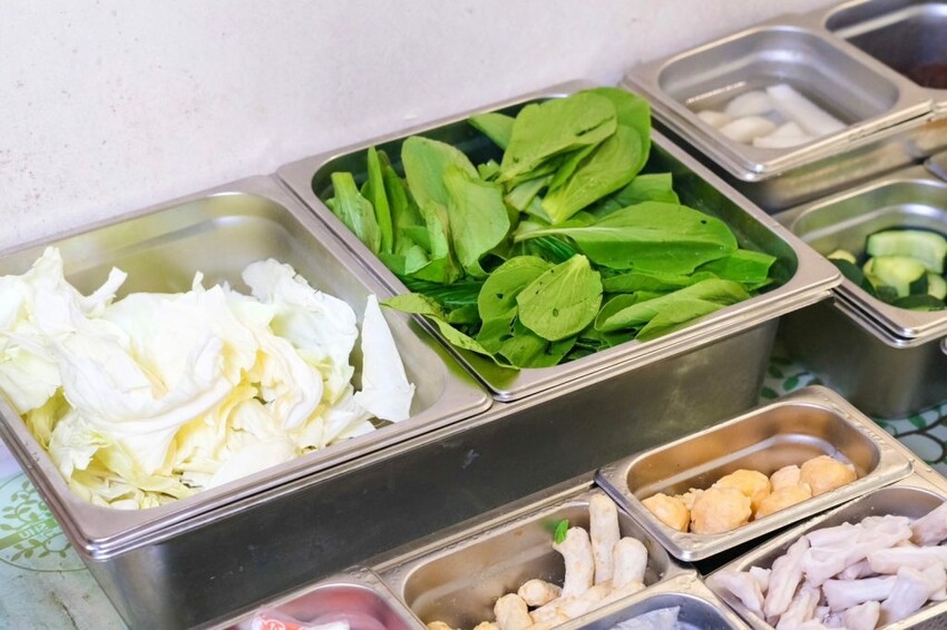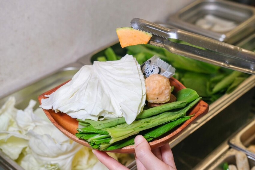 ▼【桐采TC Shabu】提供蔬菜/鍋料/白飯/飲料/冰淇淋/霜淇淋自助無限吃到飽,當季新鮮選購的在地時蔬,每一次來吃到的品項都會不一樣,這次吃到高麗菜、青江菜、木耳、白蘿蔔、南瓜、櫛瓜、香菇、金針菇等,新鮮度和水份都很足夠,鍋料私心推薦手工貢丸,咬下去還會噴汁超過癮!